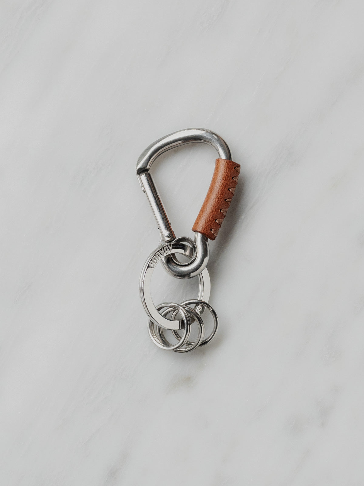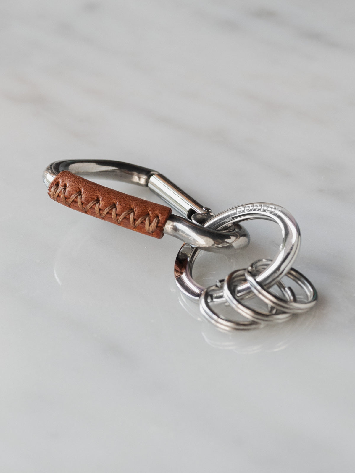 The Carabiner Keychain utilises an Italian made 316 AISI stainless steel carabine with a steel eye that holds the split ring in place. An Italian vegetable tanned Buttero leather tab is Z-stitched to the spine with German Ritza thread. The tab provides extra grip when clipping and unclipping the keychain. The carabiner snaps shut with its spring loaded straight gate and is tested to a breaking load of 150 Kg.