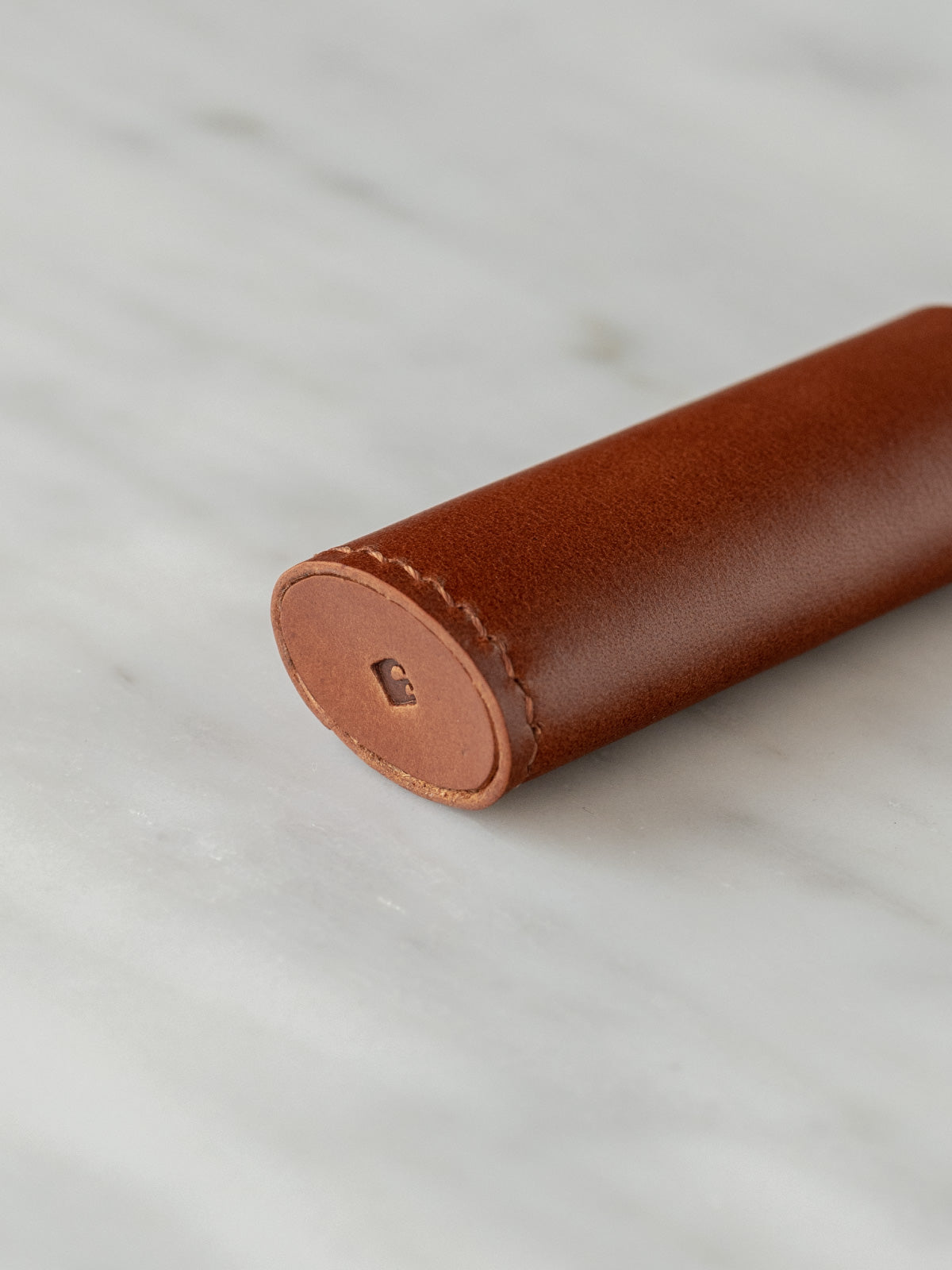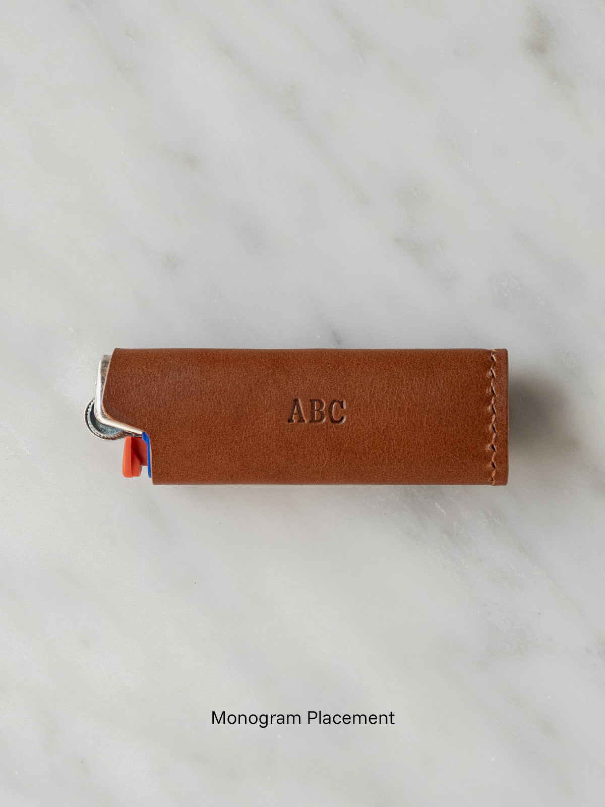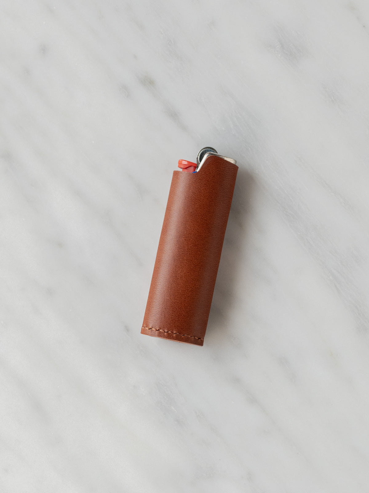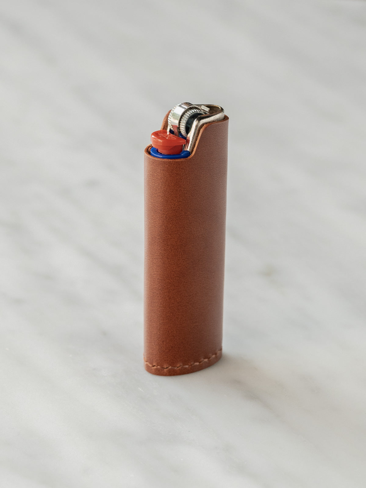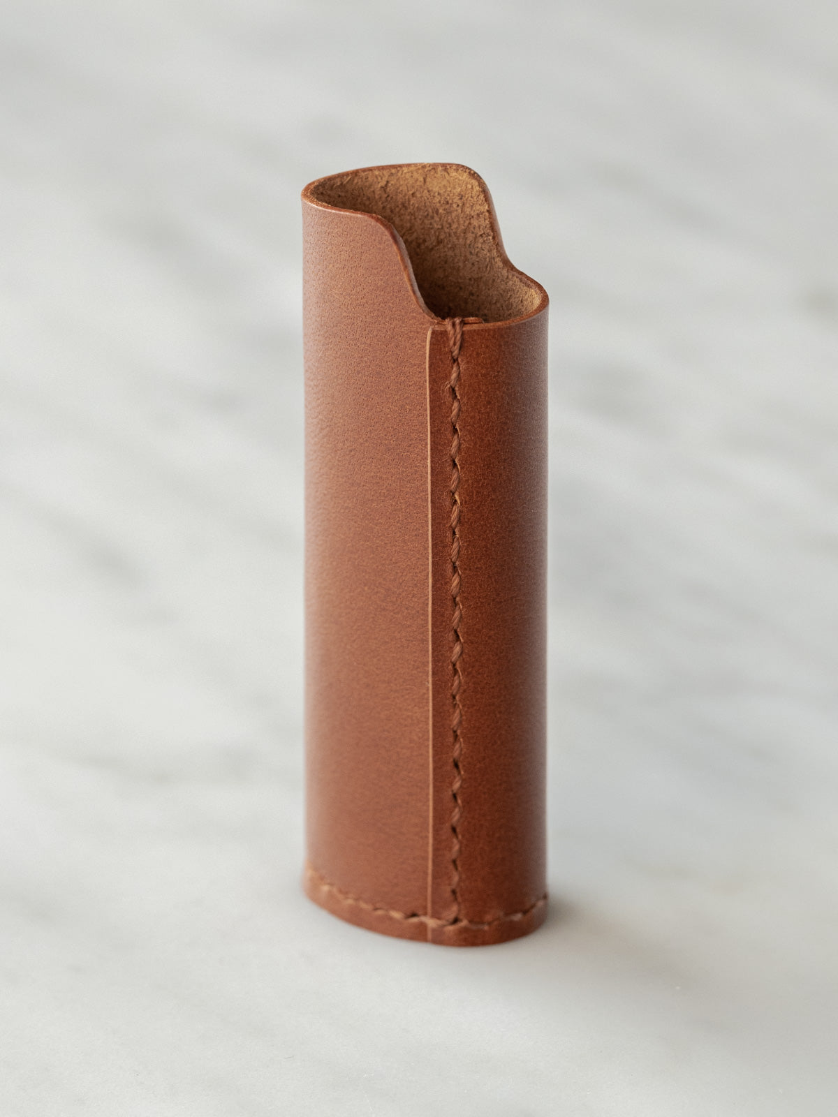 The lighter case elevates a standard Bic lighter in a wrap of Italian vegetable tanned Buttero leather with a flat base which allows it to stand upright. The case is saddle stitched by hand with Japanese Vinymo MBT thread.
