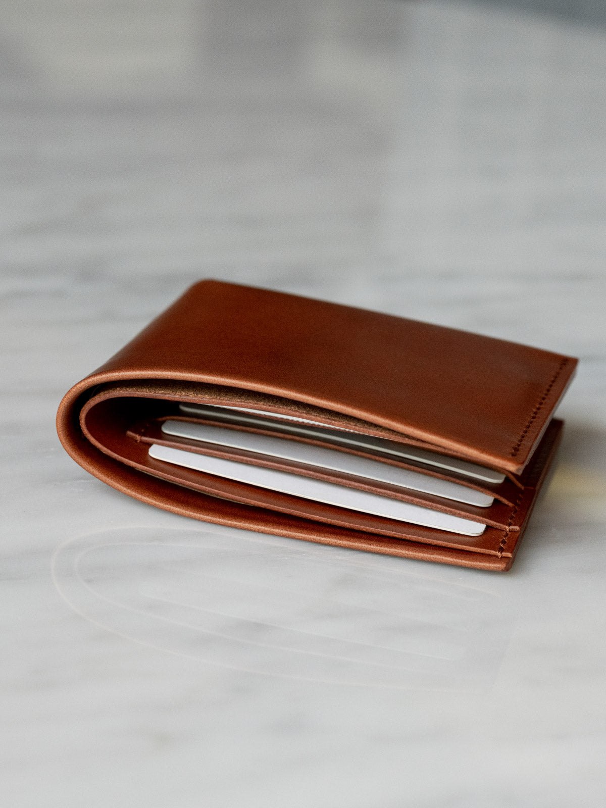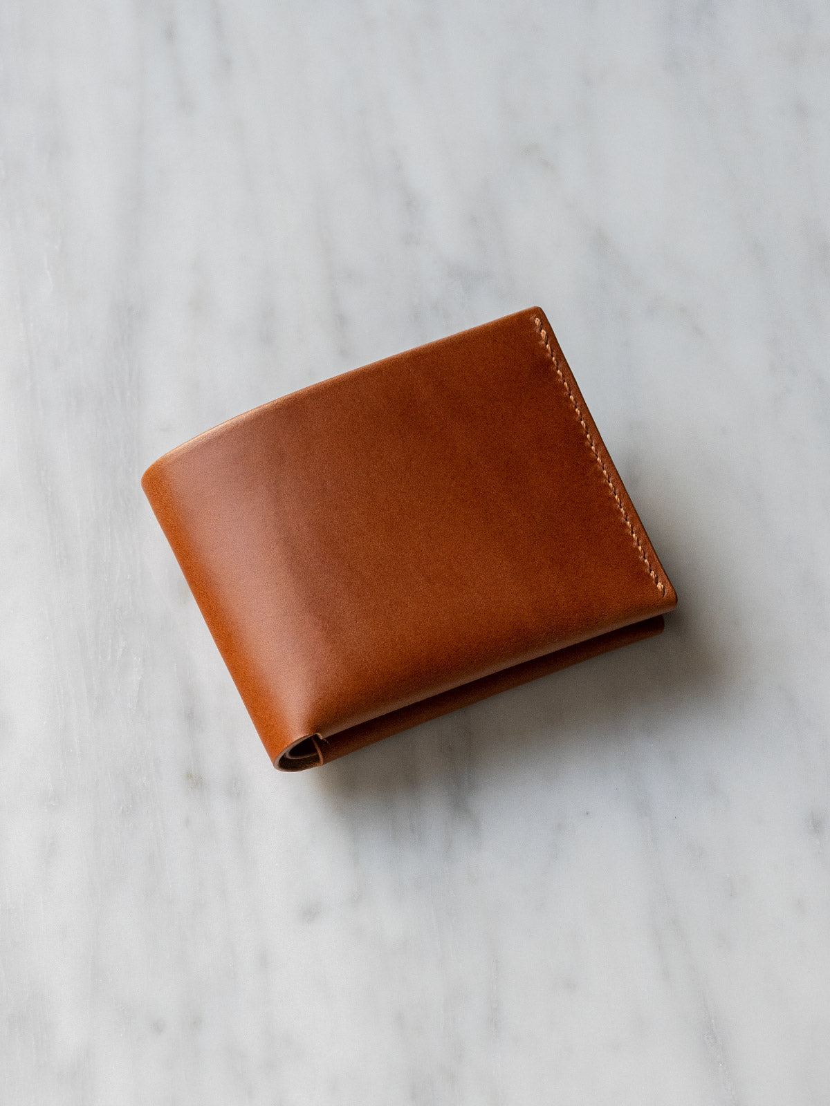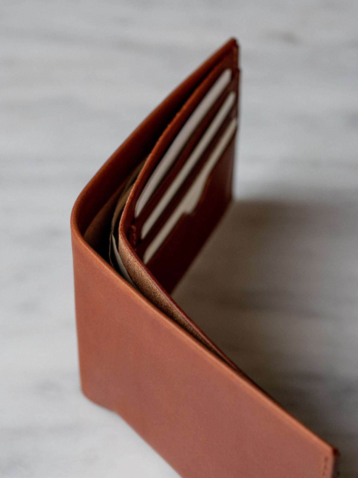 Crafted entirely of Italian vegetable tanned Buttero leather, the bi-fold wallet features 6 card slots and a lengthwise bill compartment to keep your cash and cards organized. Only one clean looking seam is visible from the outside giving the wallet a minimal, modern look. The seams are saddle stitched by hand with Japanese Vinymo MBT thread for durability and longevity.