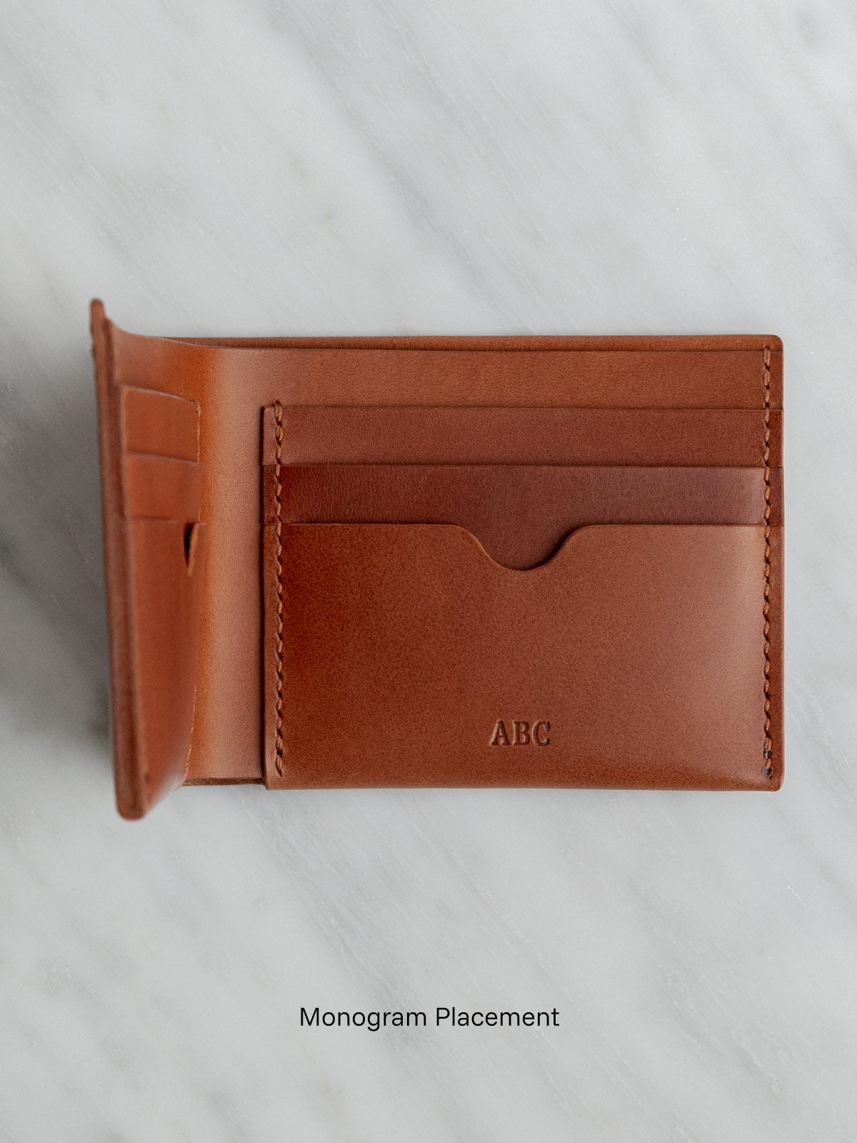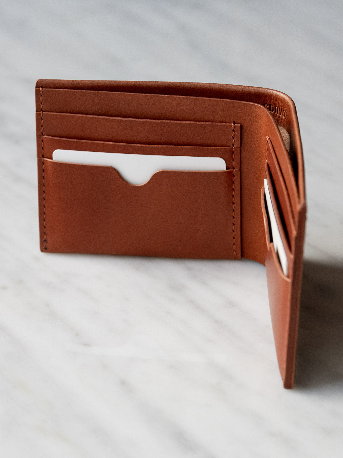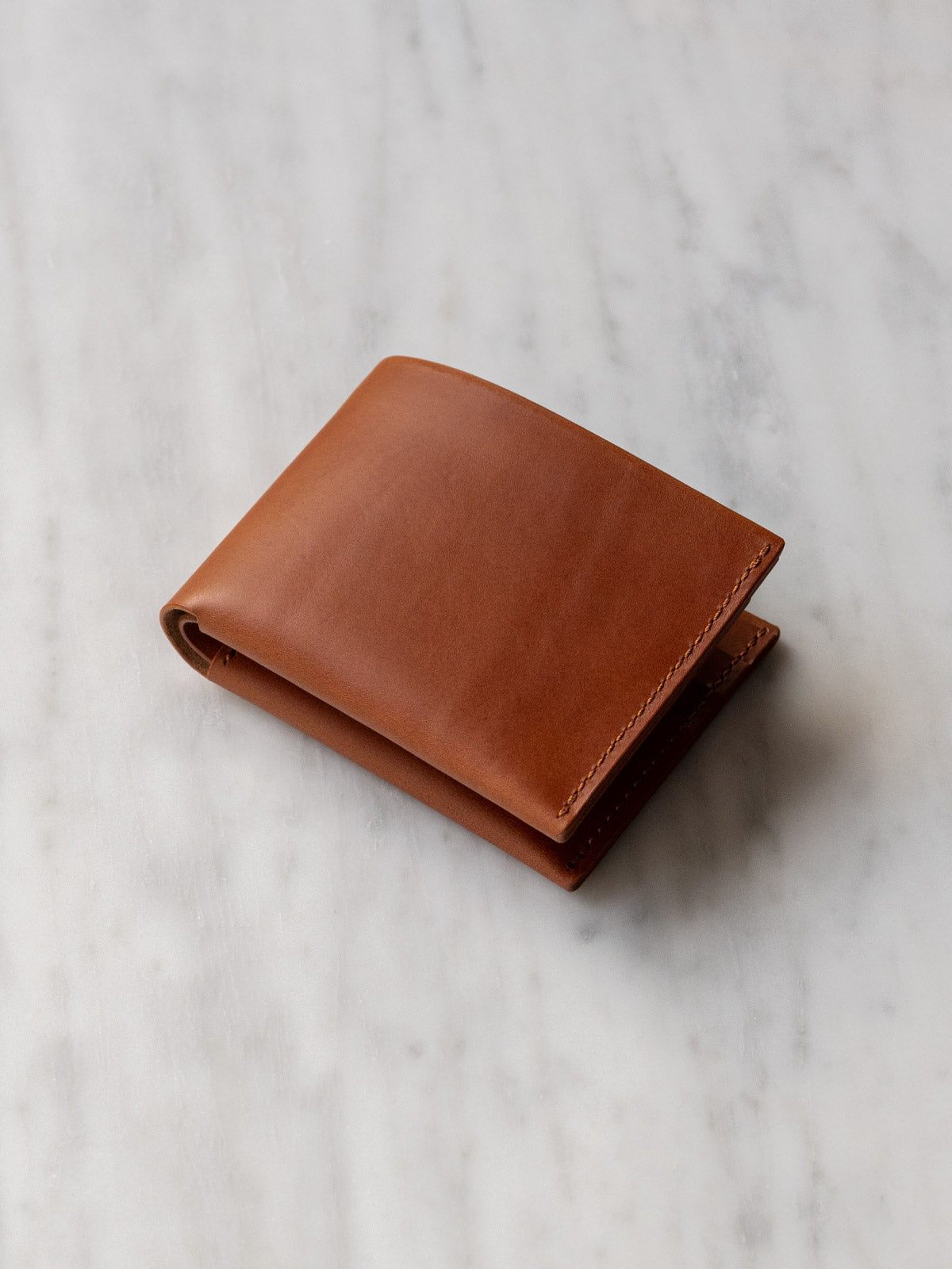 Crafted entirely of Italian vegetable tanned Buttero leather, the bi-fold wallet features 6 card slots and a lengthwise bill compartment to keep your cash and cards organized. Only one clean looking seam is visible from the outside giving the wallet a minimal, modern look. The seams are saddle stitched by hand with Japanese Vinymo MBT thread for durability and longevity.