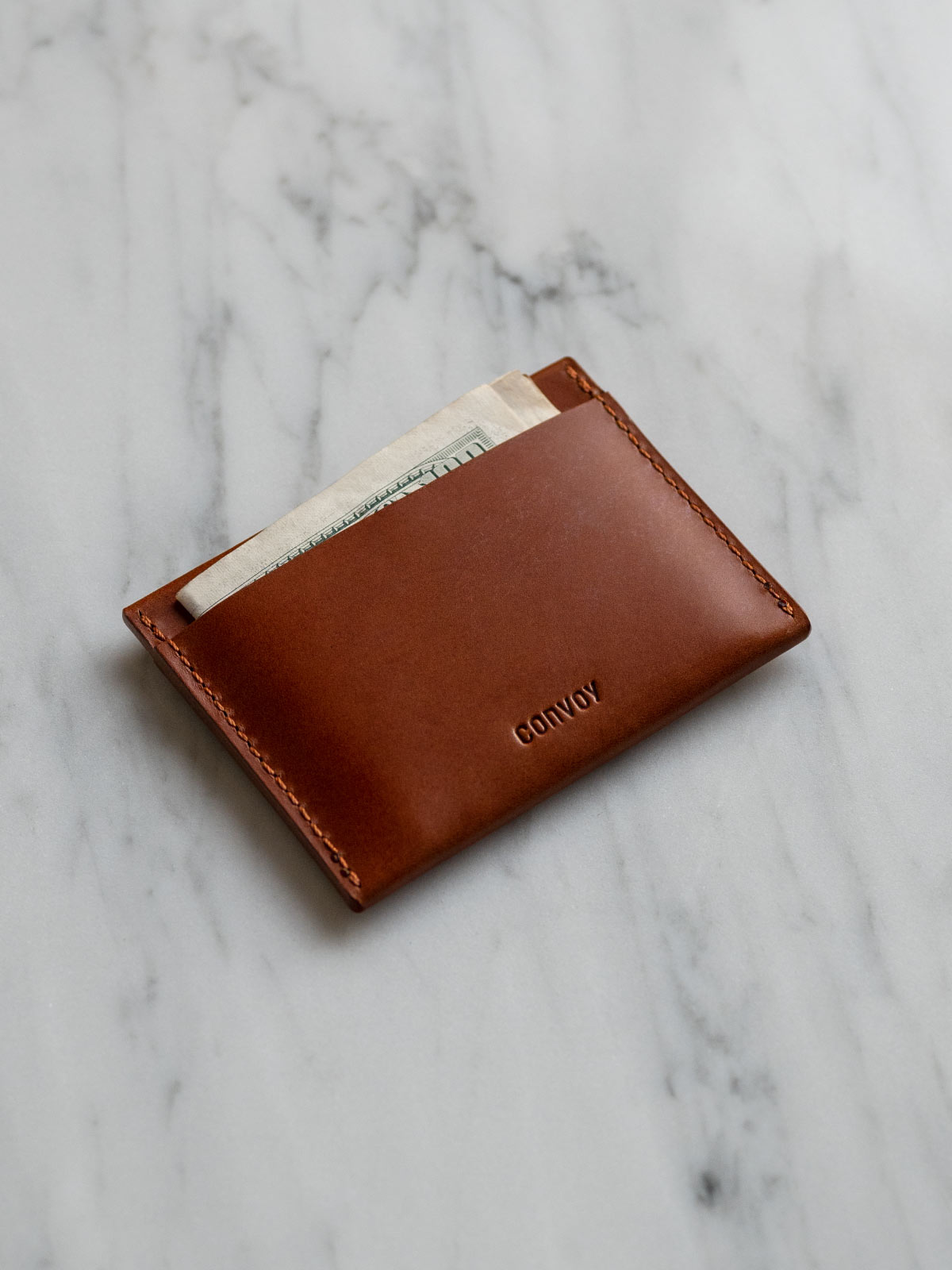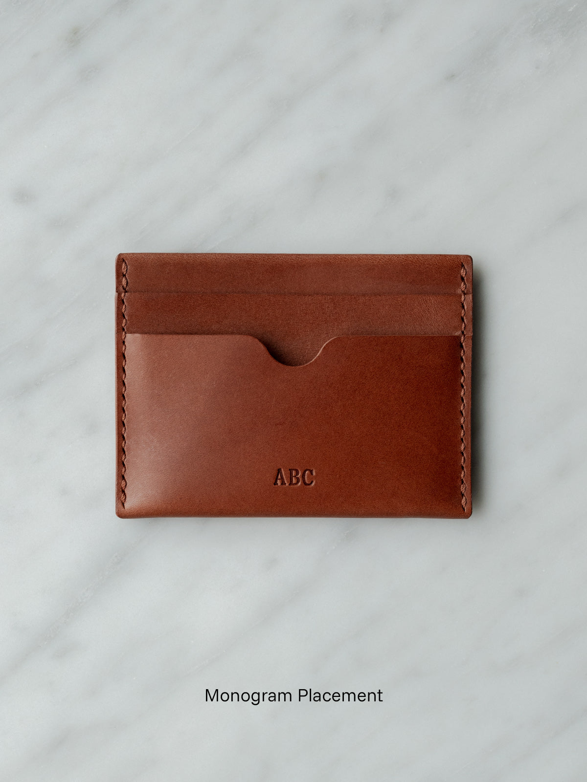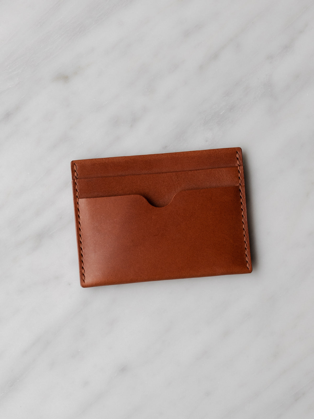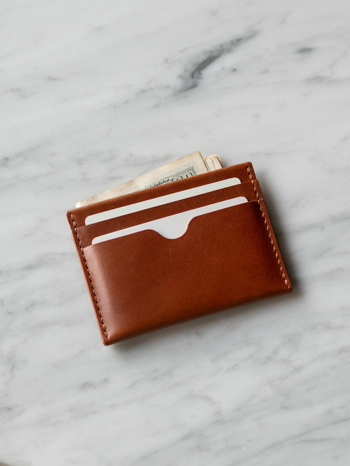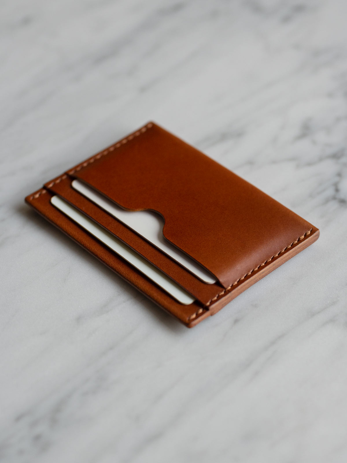 Designed to be slim and go with you everywhere, this minimal wallet is meant to keep your cards and cash organized in 3 separate pockets. Italian vegetable tanned Buttero leather is folded into pockets to reduce the amount of seams to only two, each of which are saddle stitched by hand with Japanese Vinymo MBT thread for durability.