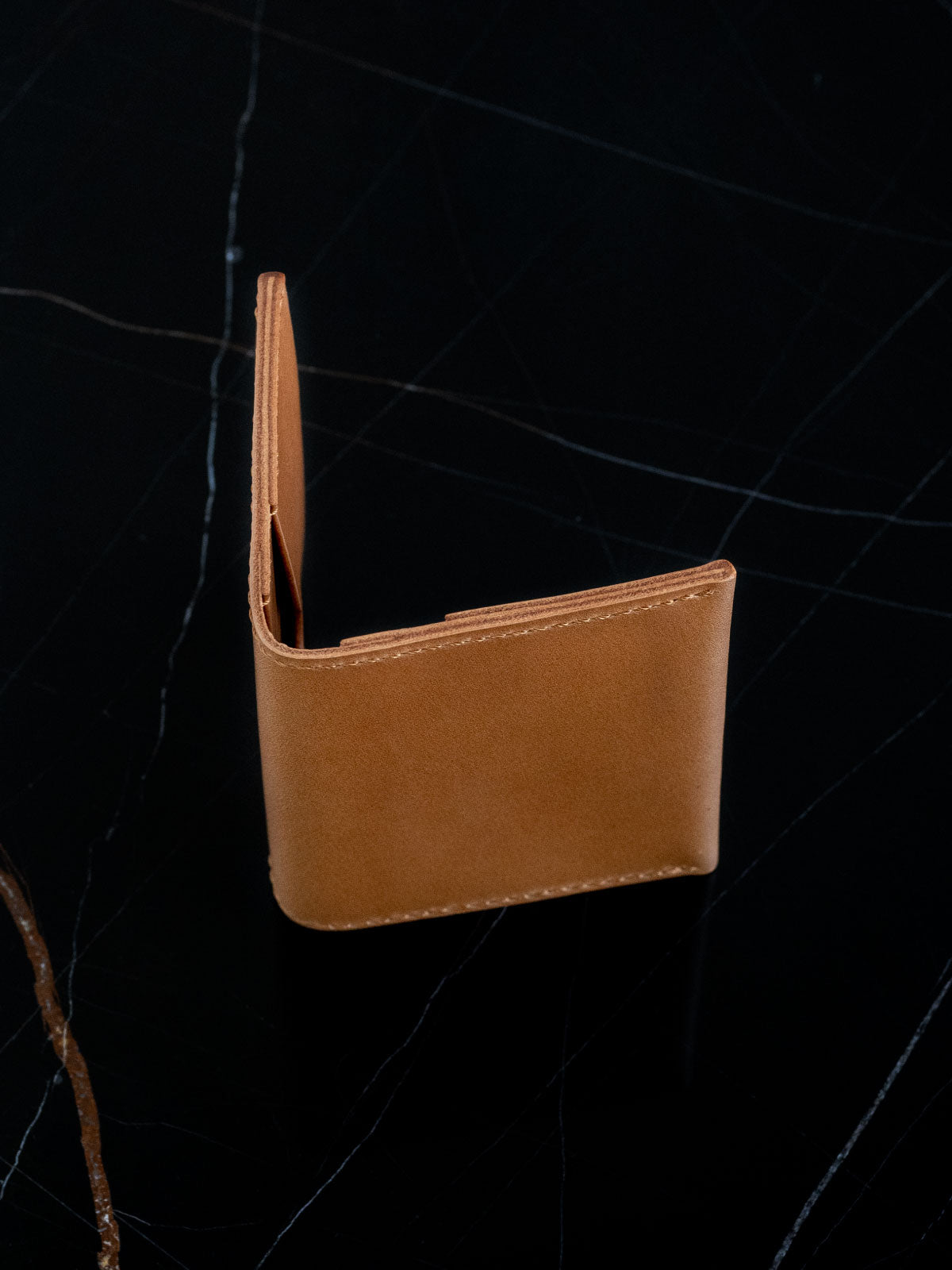 The leather is folded and stitched with Japanese Vinymo MBT thread to create two card slots and two deep pockets for folded bills.