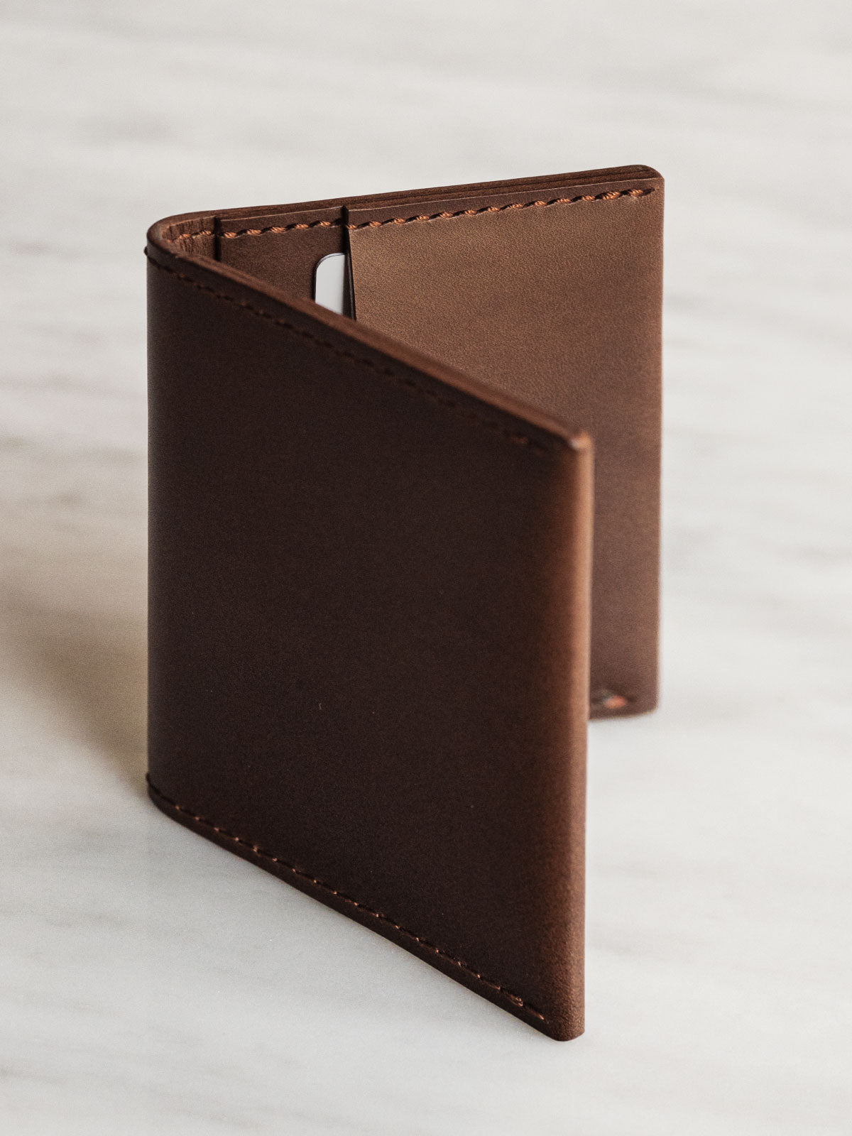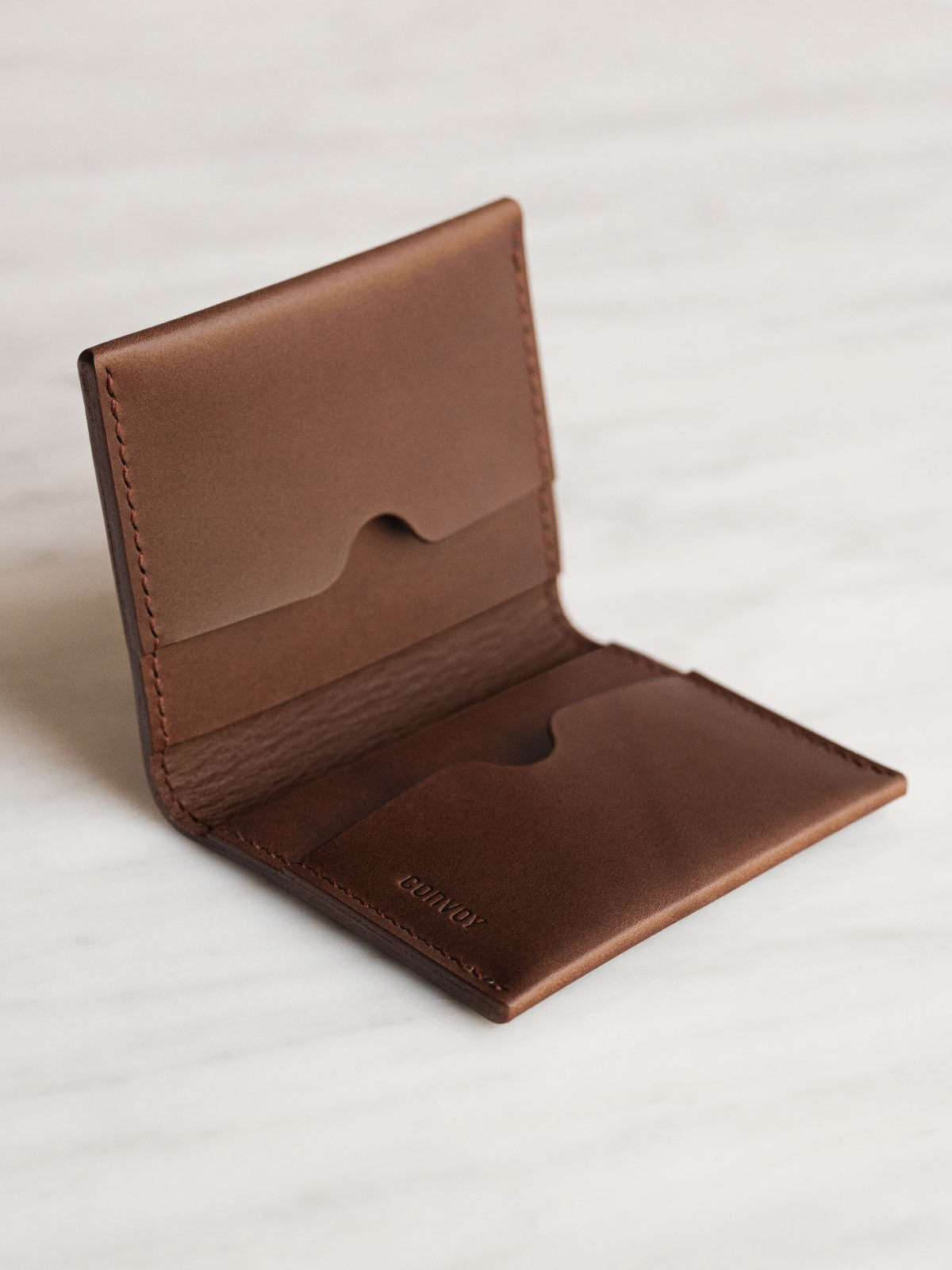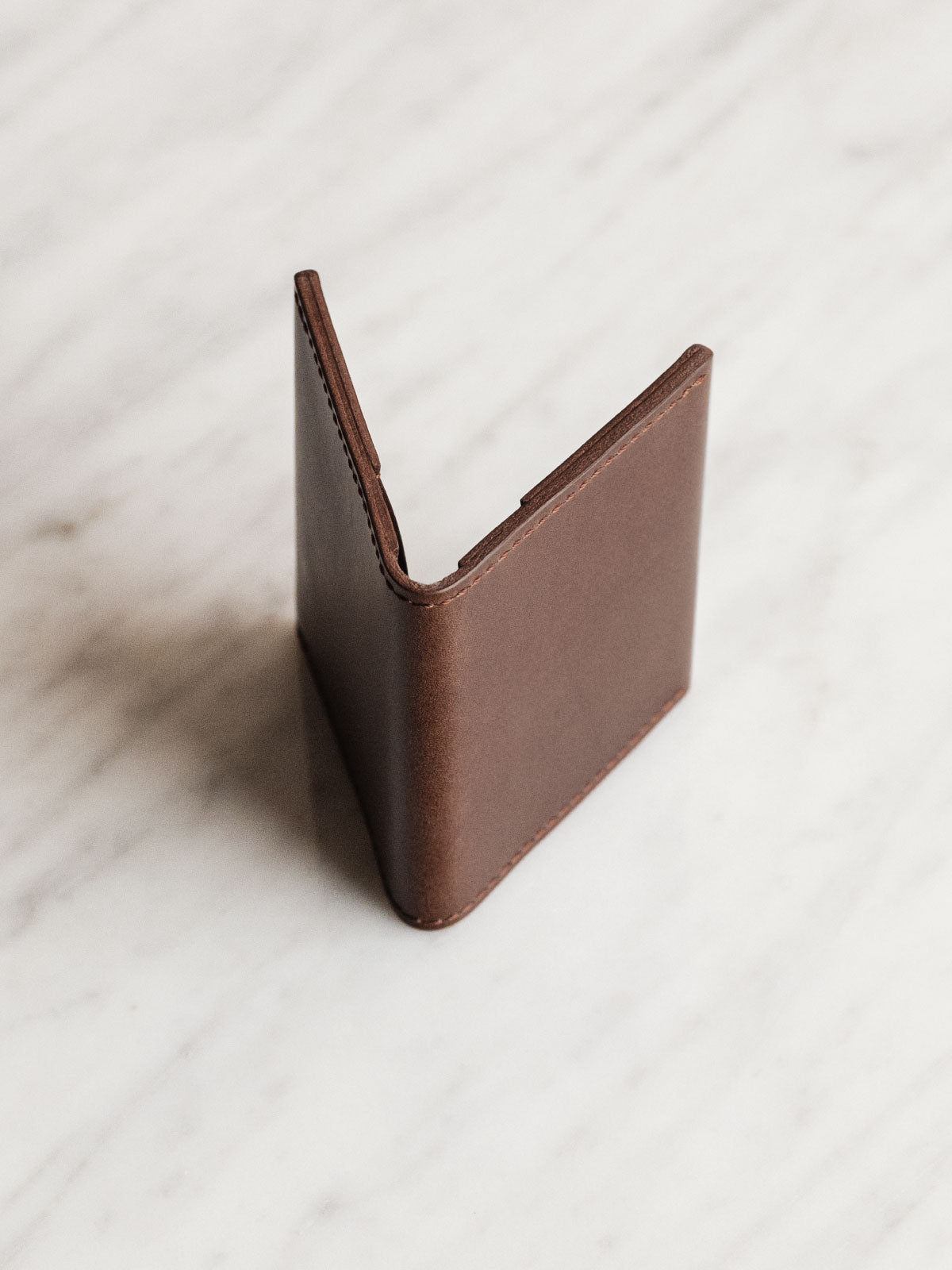 The vertical wallet offers all the functionality of a traditional wallet with the minimal look of a folded card case in Italian vegetable tanned Buttero leather.