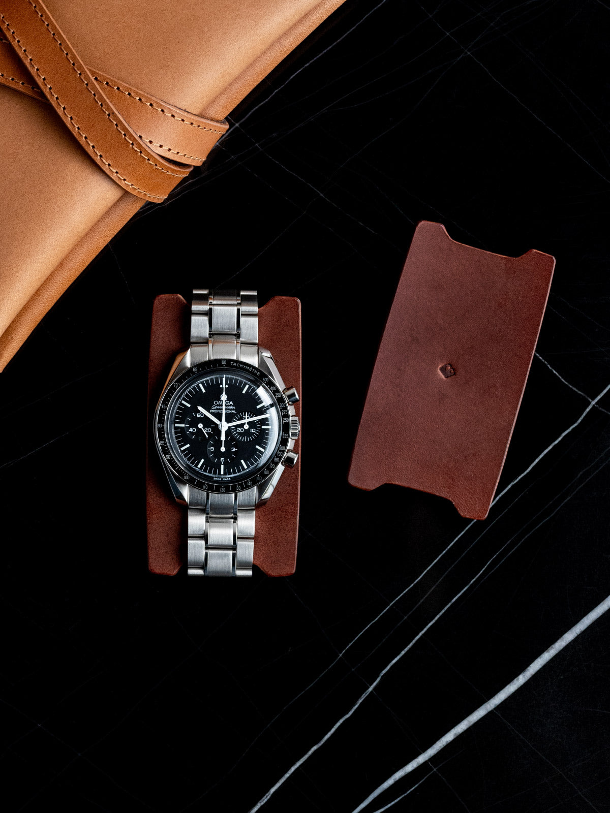 It includes two Buttero leather watch rests for your watches to wrap around, protecting their casebacks from scratches.