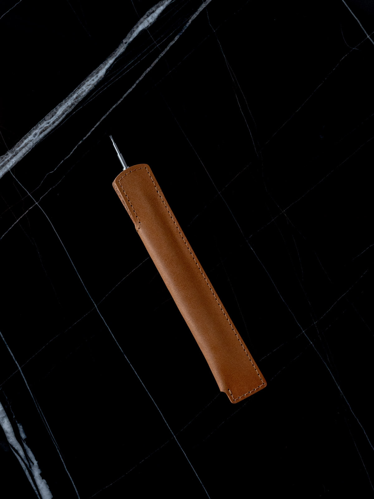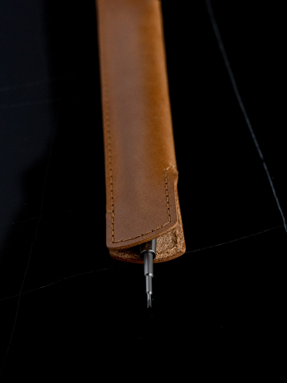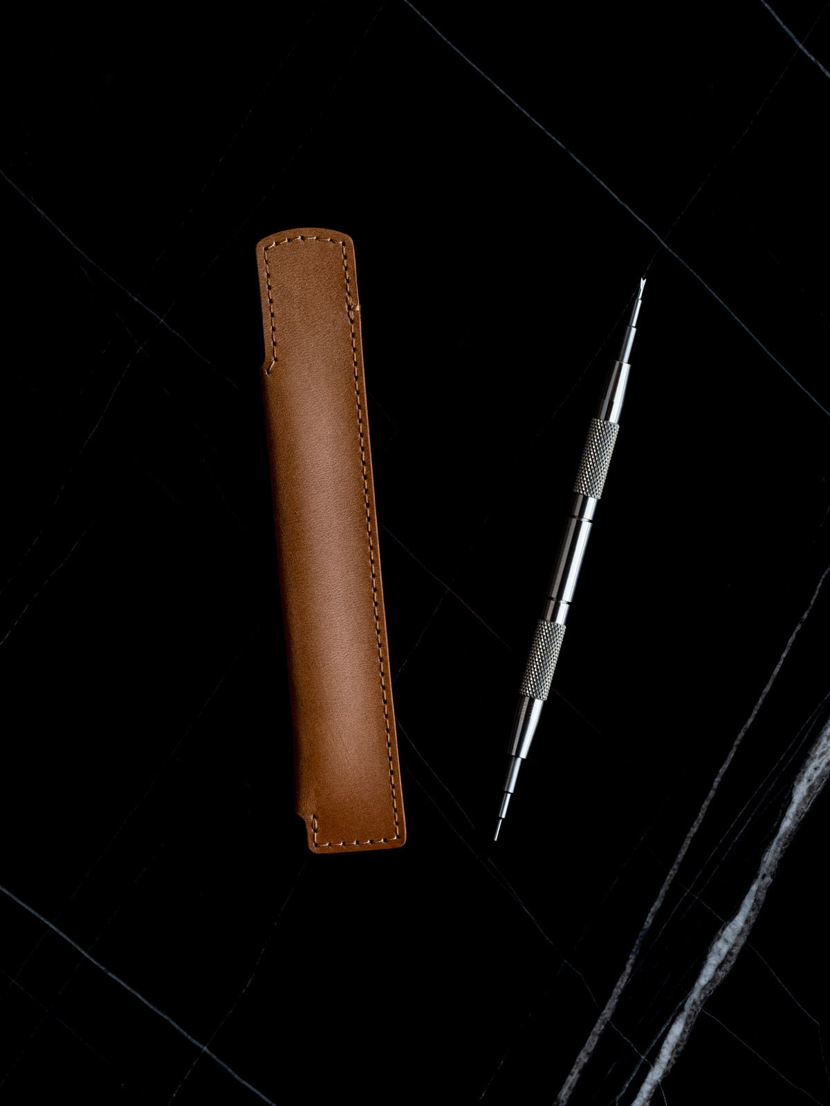 The spring bar tool pouch is designed to snugly wrap your favourite strap changing tool in a fold of Italian vegetable tanned Buttero leather, protecting the tips of your spring bar tool. The edges are burnished by hand to a smooth finish and side stitched for extra reinforcement.