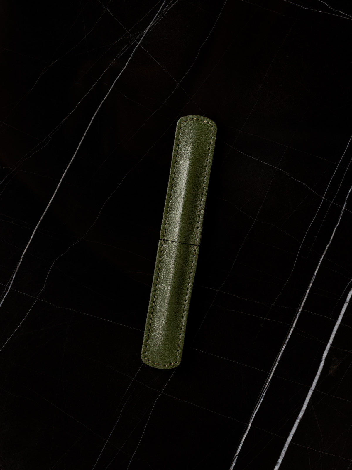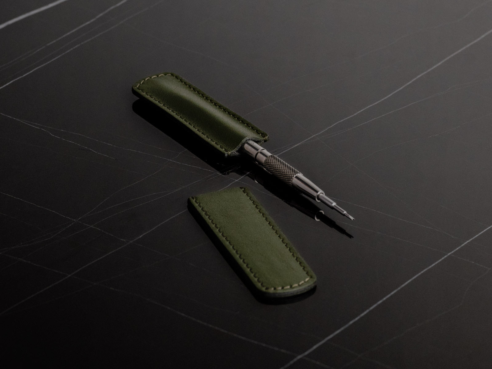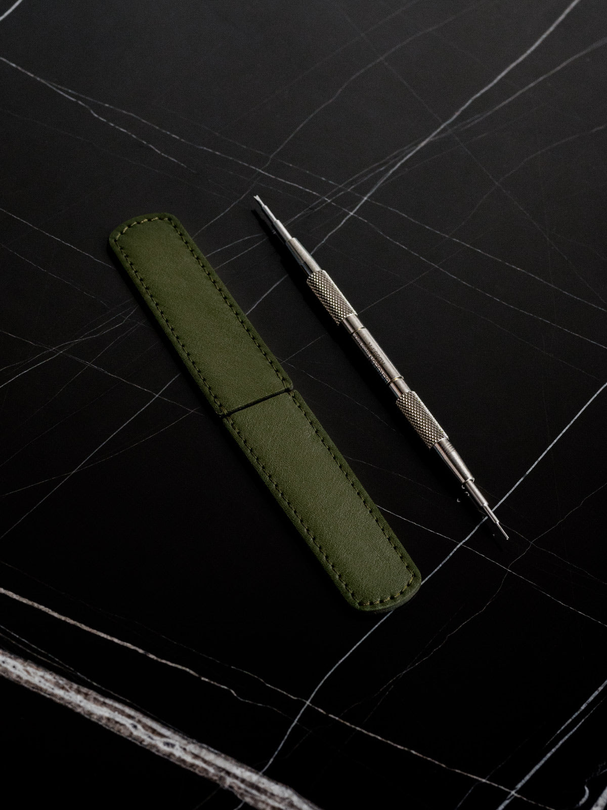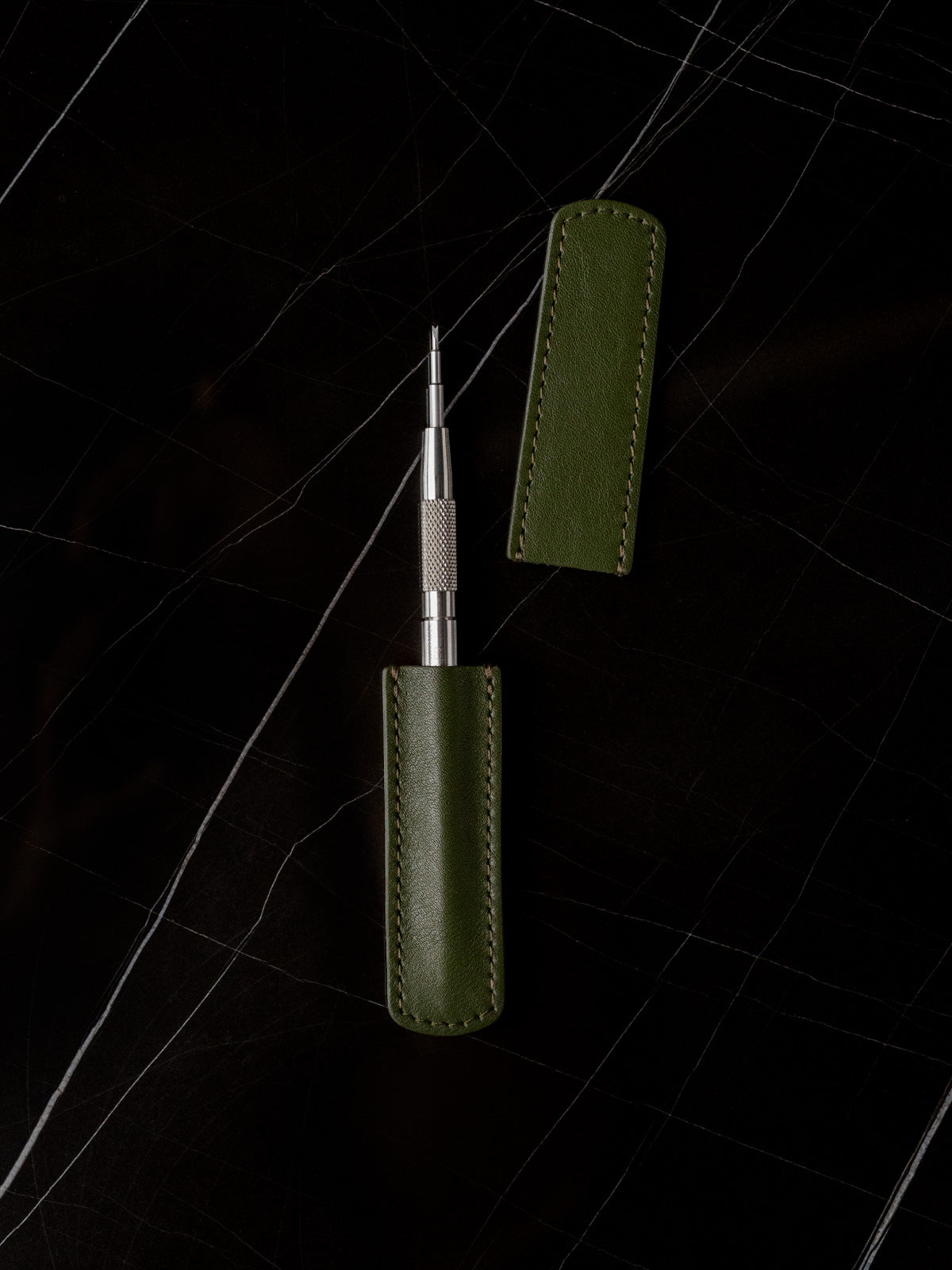 The spring bar tool sleeve is designed specifically to protect the tips of your spring bar tool. The sleeve is constructed of Italian full-grain Nappa leather and fits snugly over the two ends of your spring bar tool for safekeeping. The edges are burnished by hand to a smooth finish and side stitched for extra reinforcement.