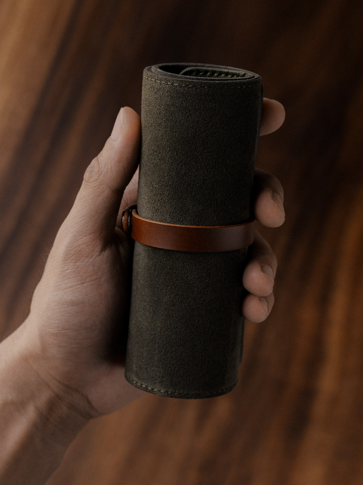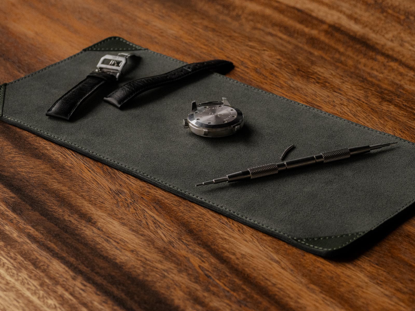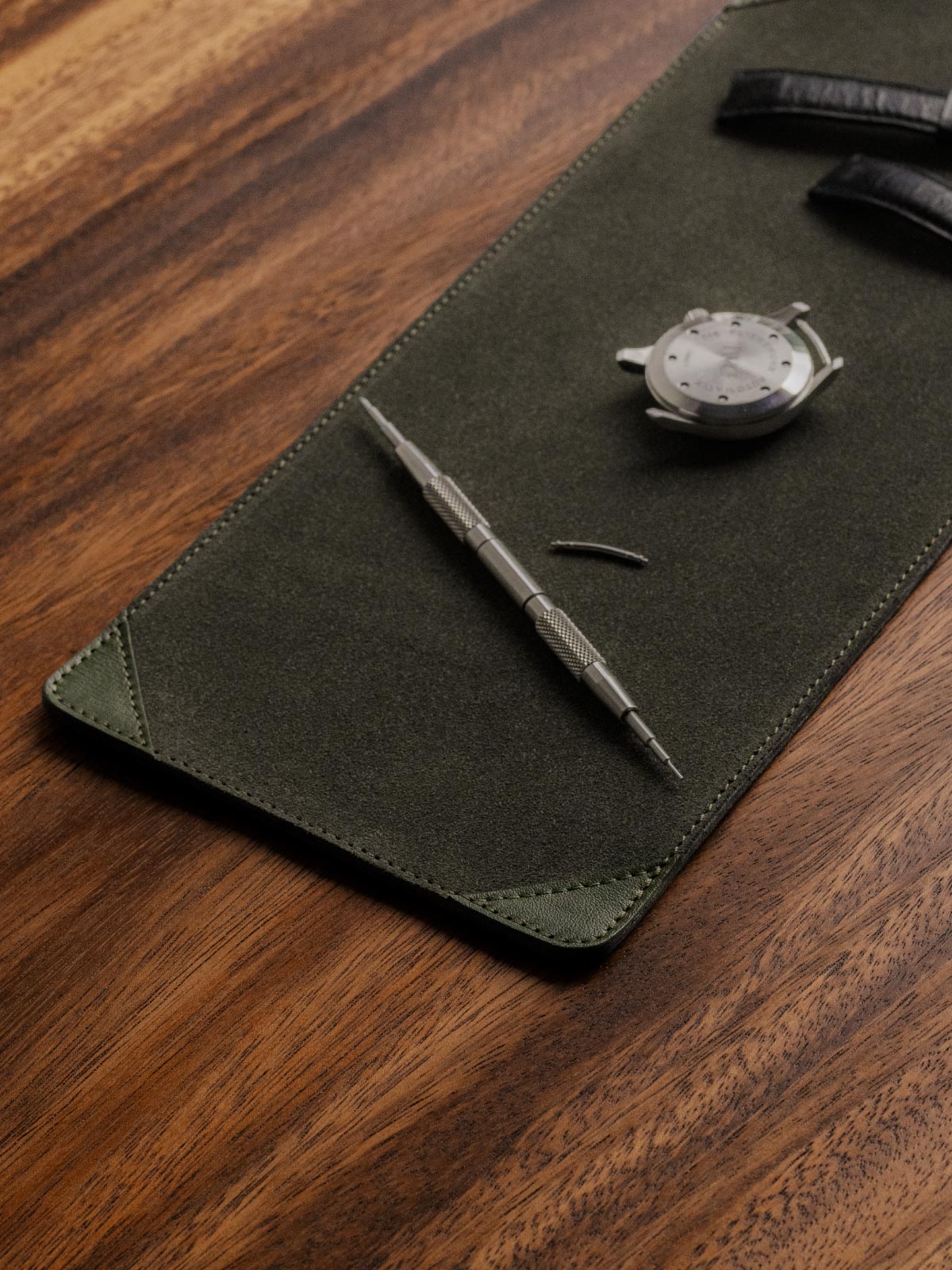 Modeled after vintage watch display trays, the strap changing mat is made from soft, double backed Italian suede. Its brushed surface offers a cushioned, non-slip surface perfect for strap changes and polishing watch crystals. The mat rolls up neatly for travel, also serving as a valet tray for small items.
