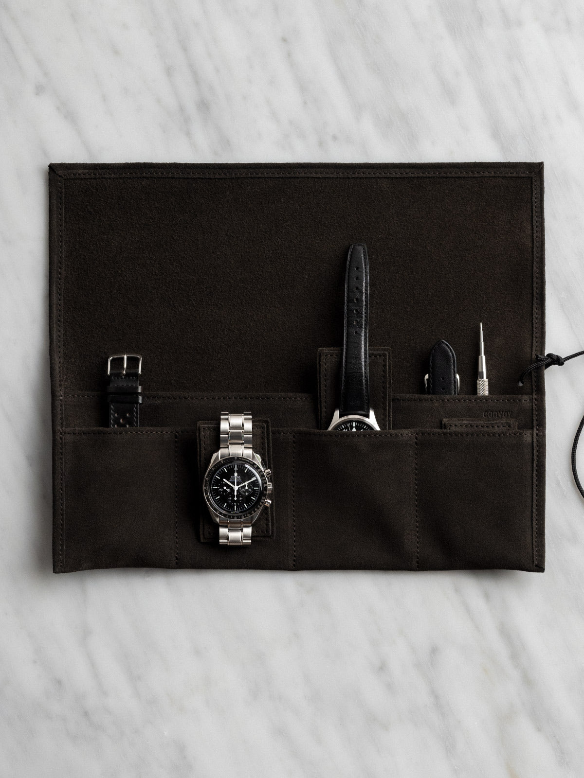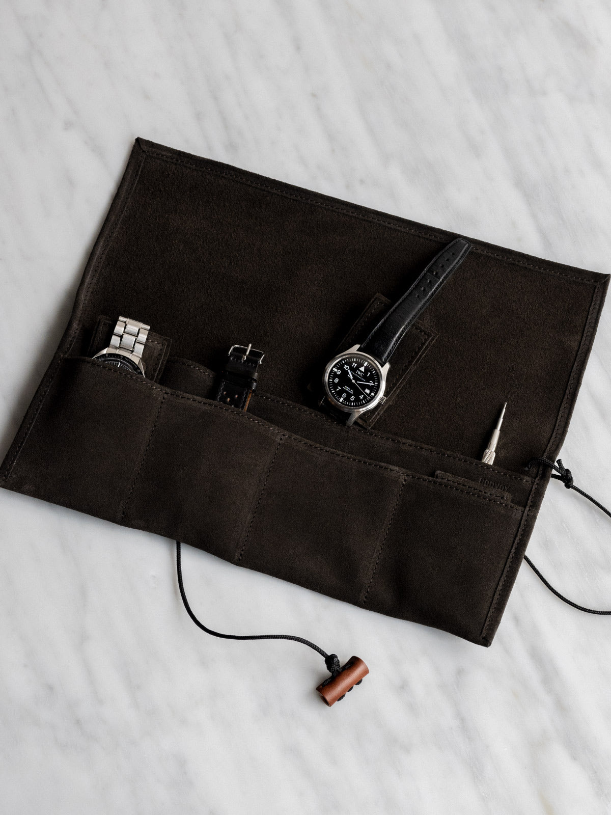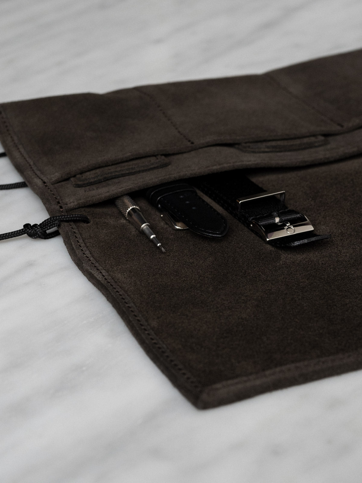 Extra straps and tools can be stored in the large pocket that spans the width of the roll which also serves as an extra layer of padding for your watches. The top flap doubles as a mat, and the brushed texture of suede makes it an ideal place for watch strap changes and cleaning your watch crystal on the go.