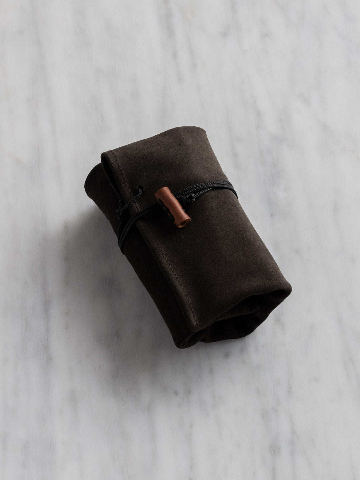 Crafted from soft Italian suede, the watch roll is thoughtfully designed to securely hold four wristwatches for your travels. Its classic design lays flat on your desk when open and conveniently rolls up, making it ideal for travel, especially when bag space is limited. When rolled, it neatly stows away in a drawer or safe.
