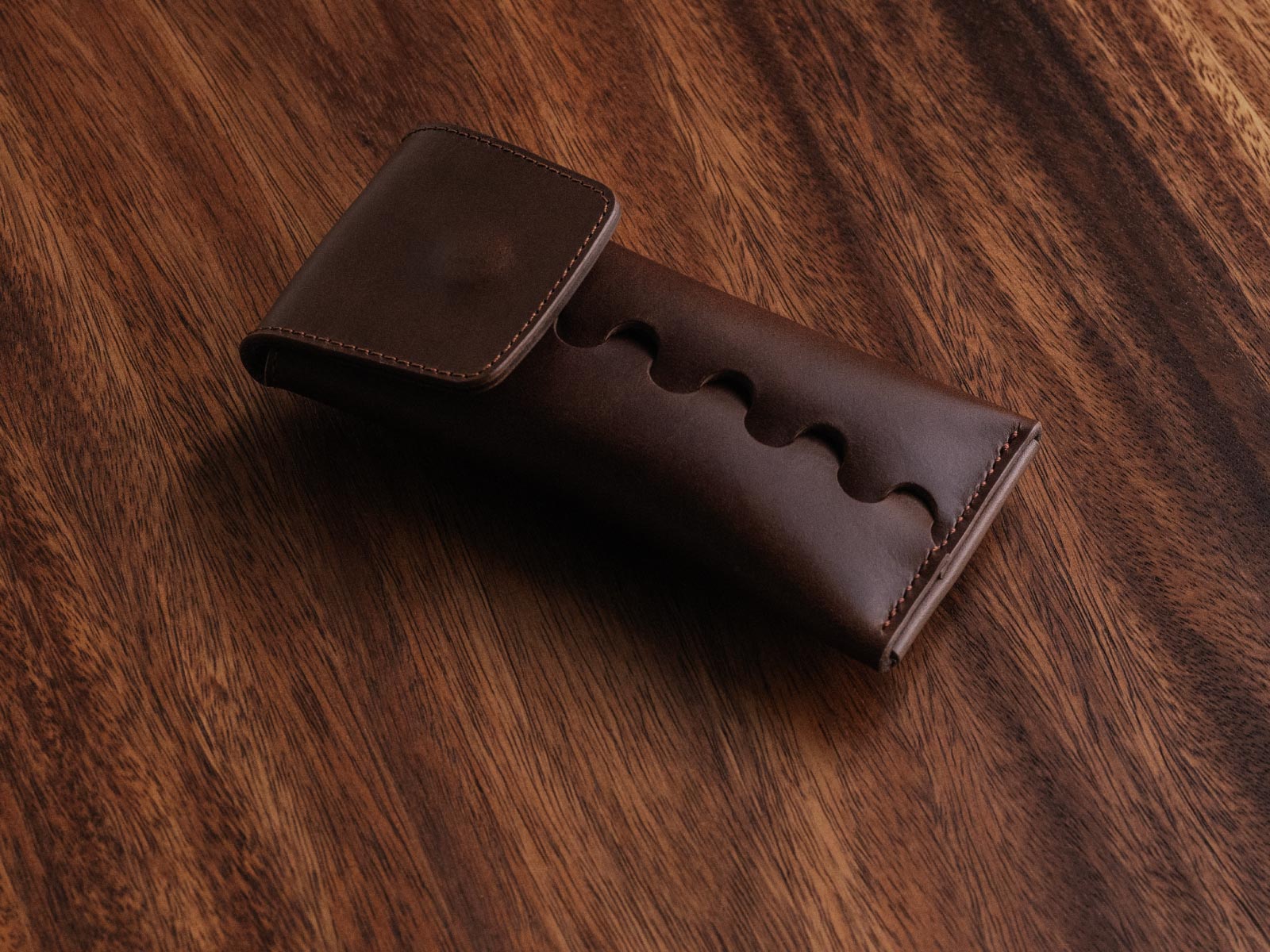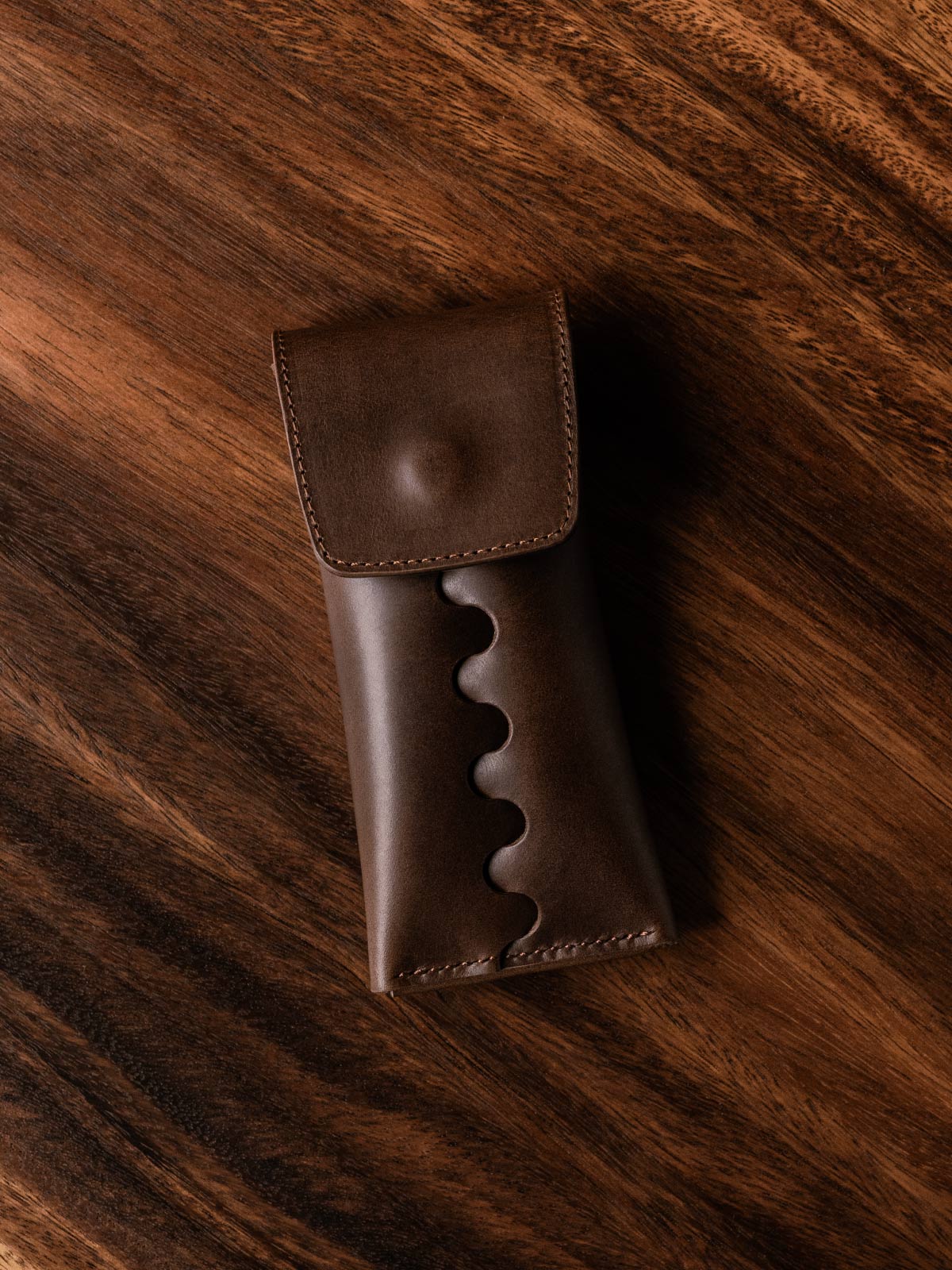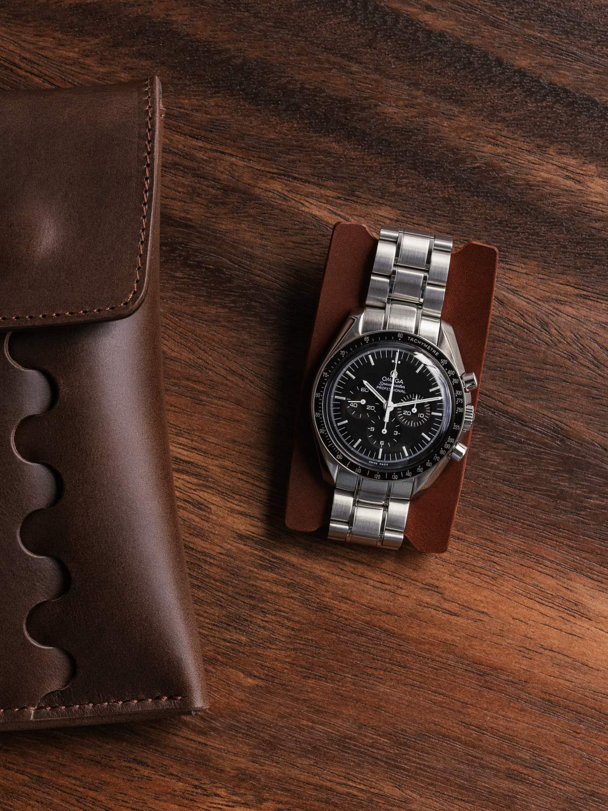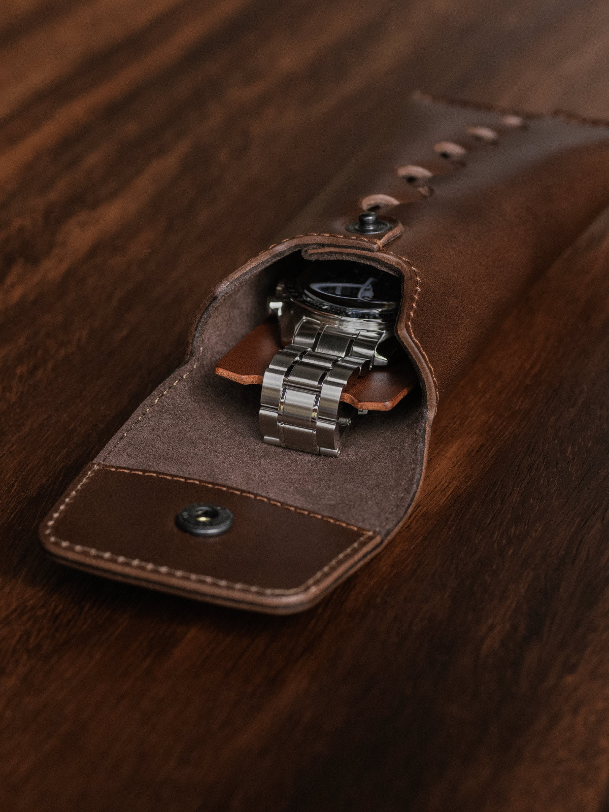 Handcrafted to hold a single timepiece, the watch pouch joins a single panel of leather using a unique interlocking design to create a cylindrical smooth surface around the pouch for a natural feel in your hand. A brass snap button closes the pouch with a secure and satisfying snap. It includes a Buttero leather watch rest for your watch to wrap around, protecting the caseback from scratches.