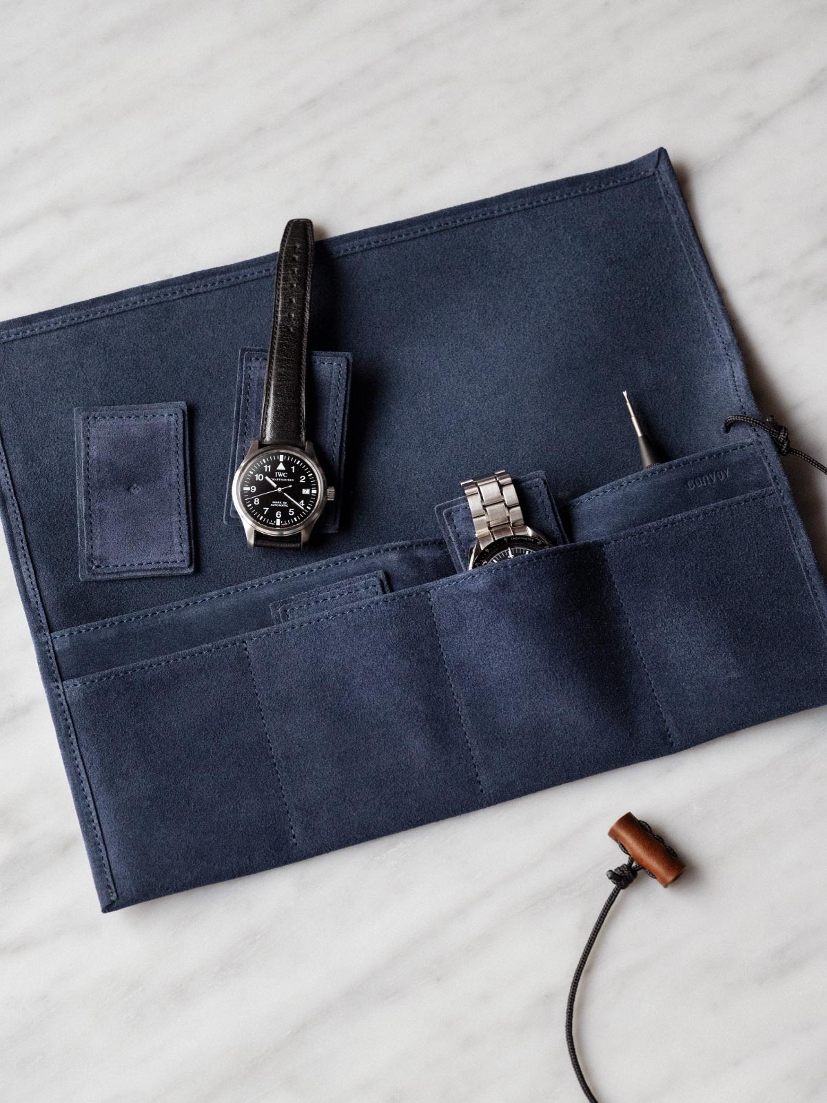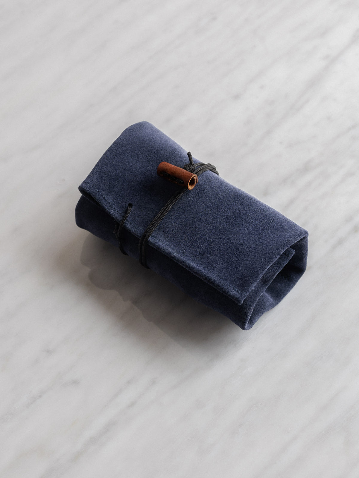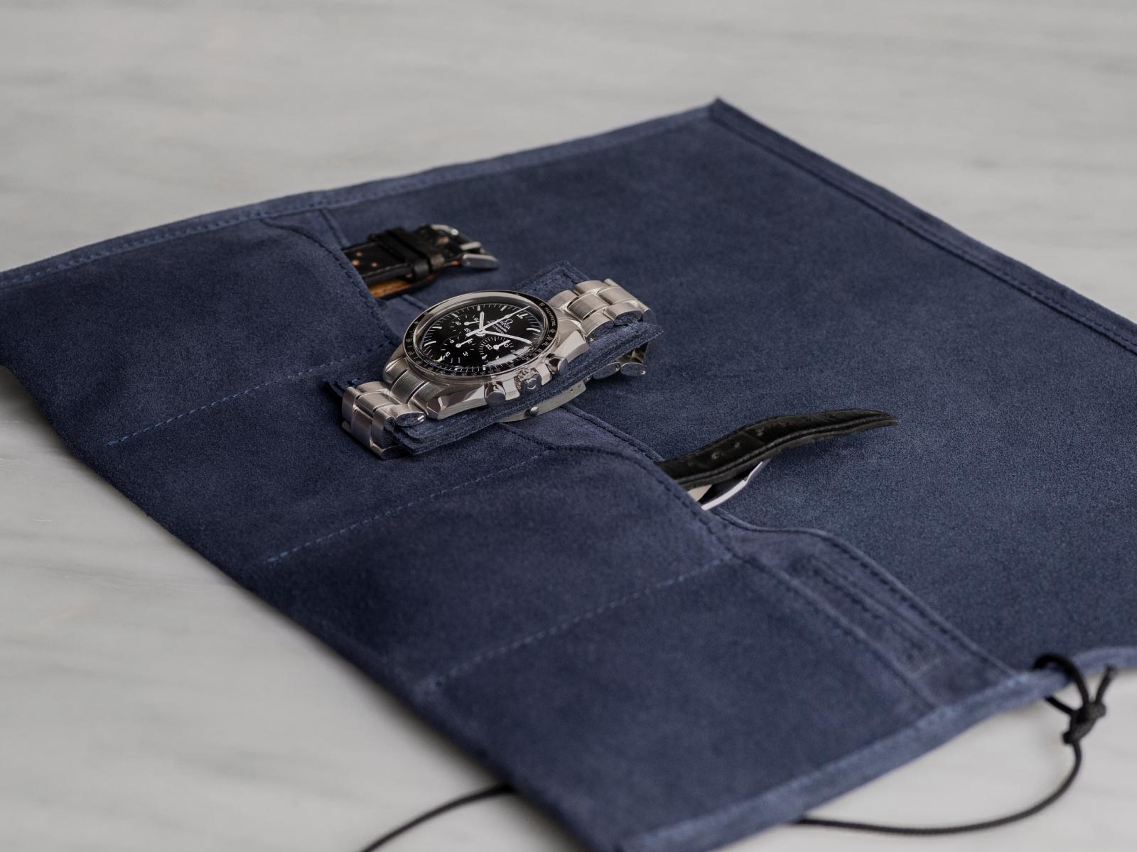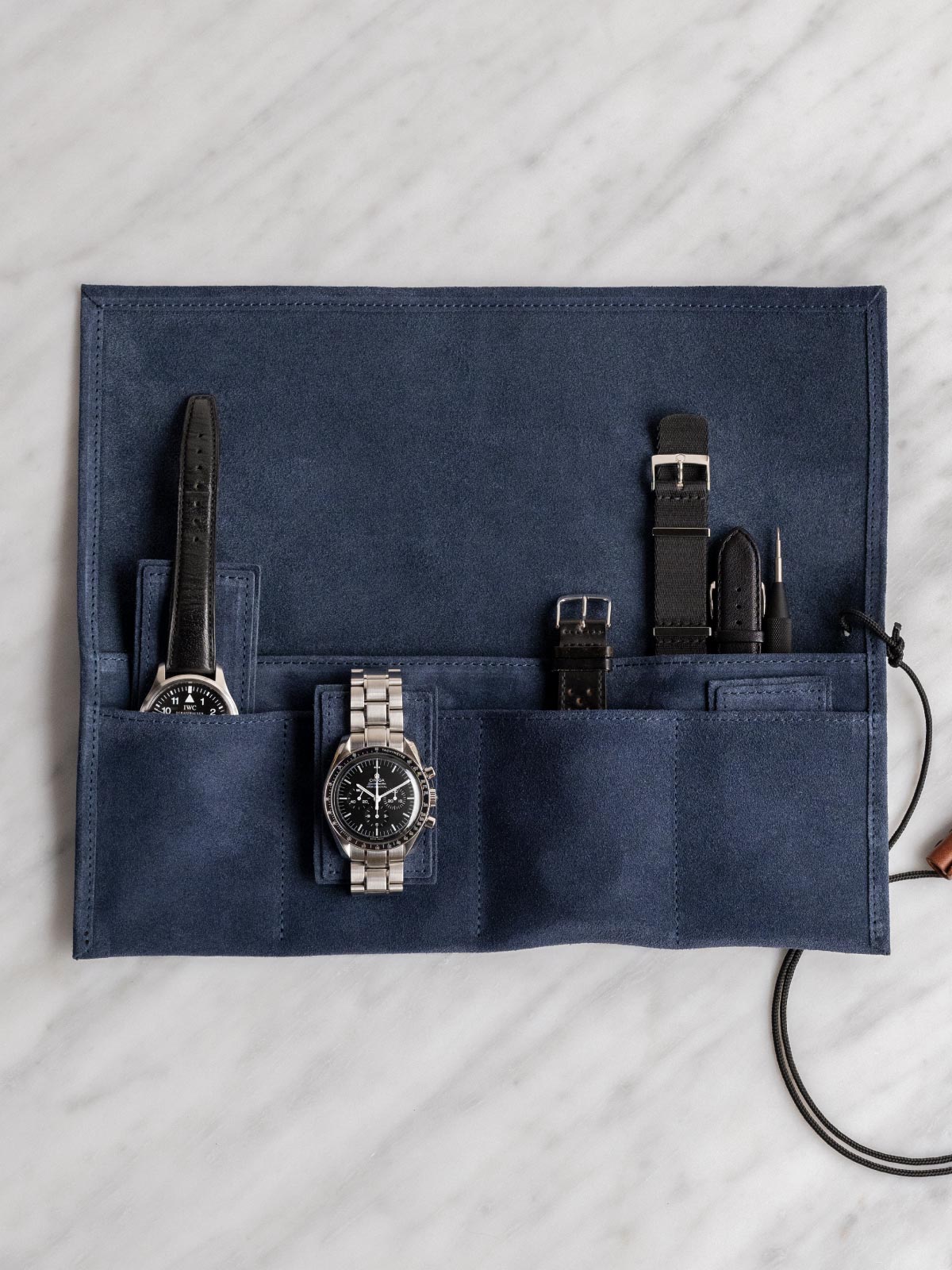 Crafted from soft Italian suede, the watch roll is thoughtfully designed to securely hold four wristwatches for your travels. Its classic design lays flat on your desk when open and conveniently rolls up, making it ideal for travel, especially when bag space is limited. When rolled, it neatly stows away in a drawer or safe.