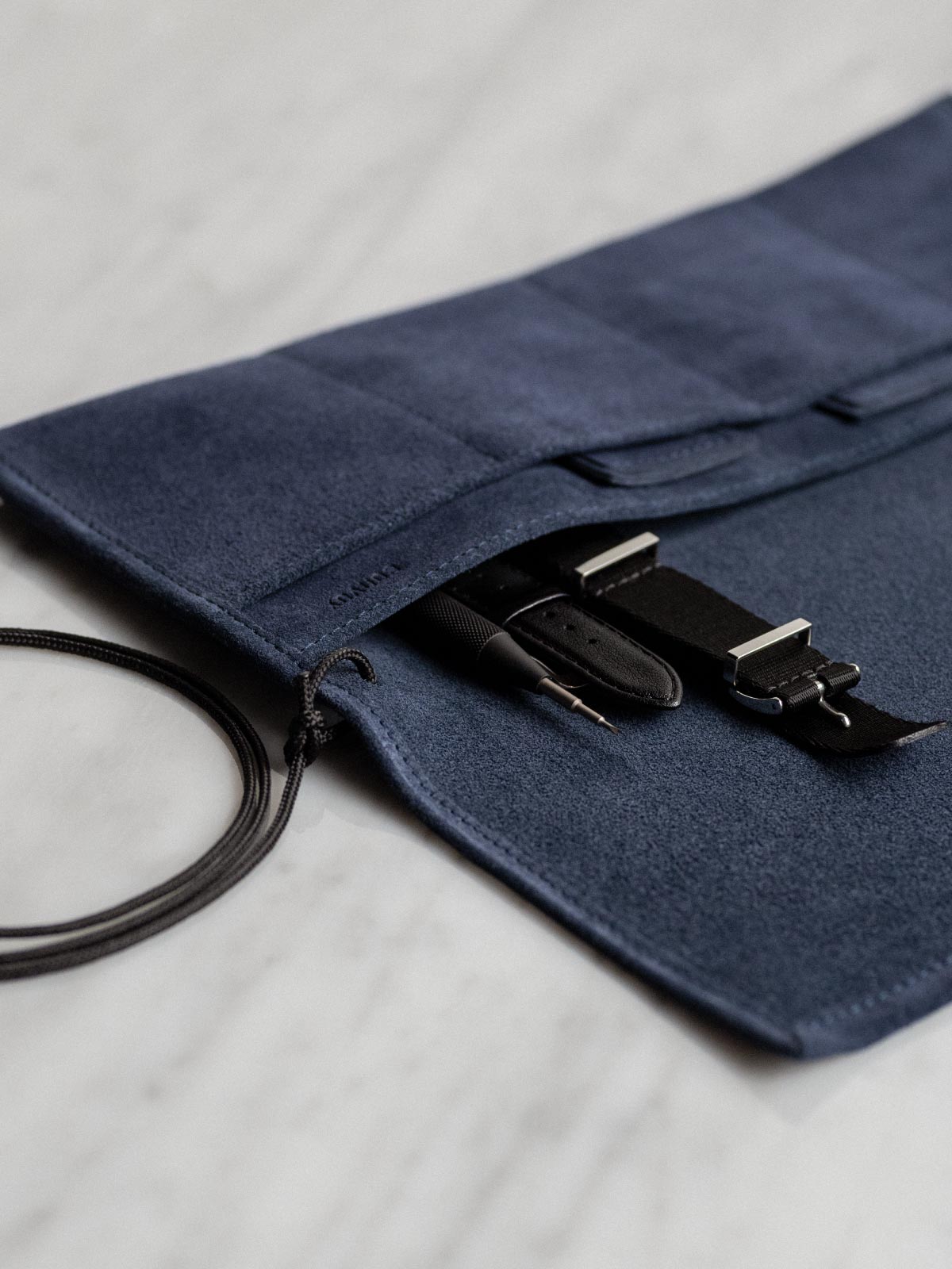 Extra straps and tools can be stored in the large pocket that spans the width of the roll which also serves as an extra layer of padding for your watches. The top flap doubles as a mat, and the brushed texture of suede makes it an ideal place for watch strap changes and cleaning your watch crystal on the go.