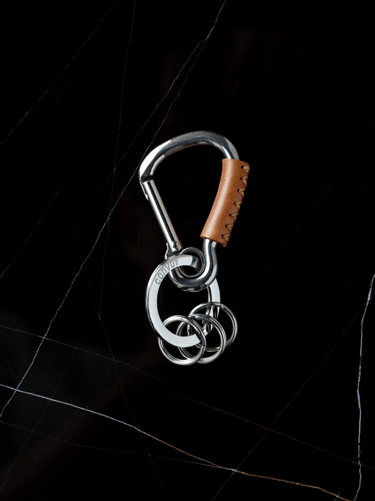 The Carabiner Keychain utilises an Italian made 316 AISI stainless steel carabine with a steel eye that holds the split ring in place. An Italian vegetable tanned Buttero leather tab is Z-stitched to the spine with German Ritza thread. The tab provides extra grip when clipping and unclipping the keychain. The carabiner snaps shut with its spring loaded straight gate and is tested to a breaking load of 150 Kg.