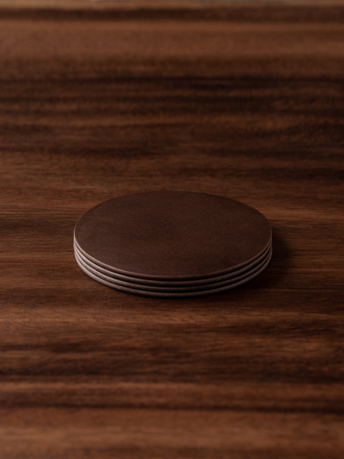 Our coaster set of four leather coasters is constructed of Italian vegetable tanned Buttero leather with a Italian Suede base to protect the surface of your table or desk. The edges are burnished by hand to a smooth finish.