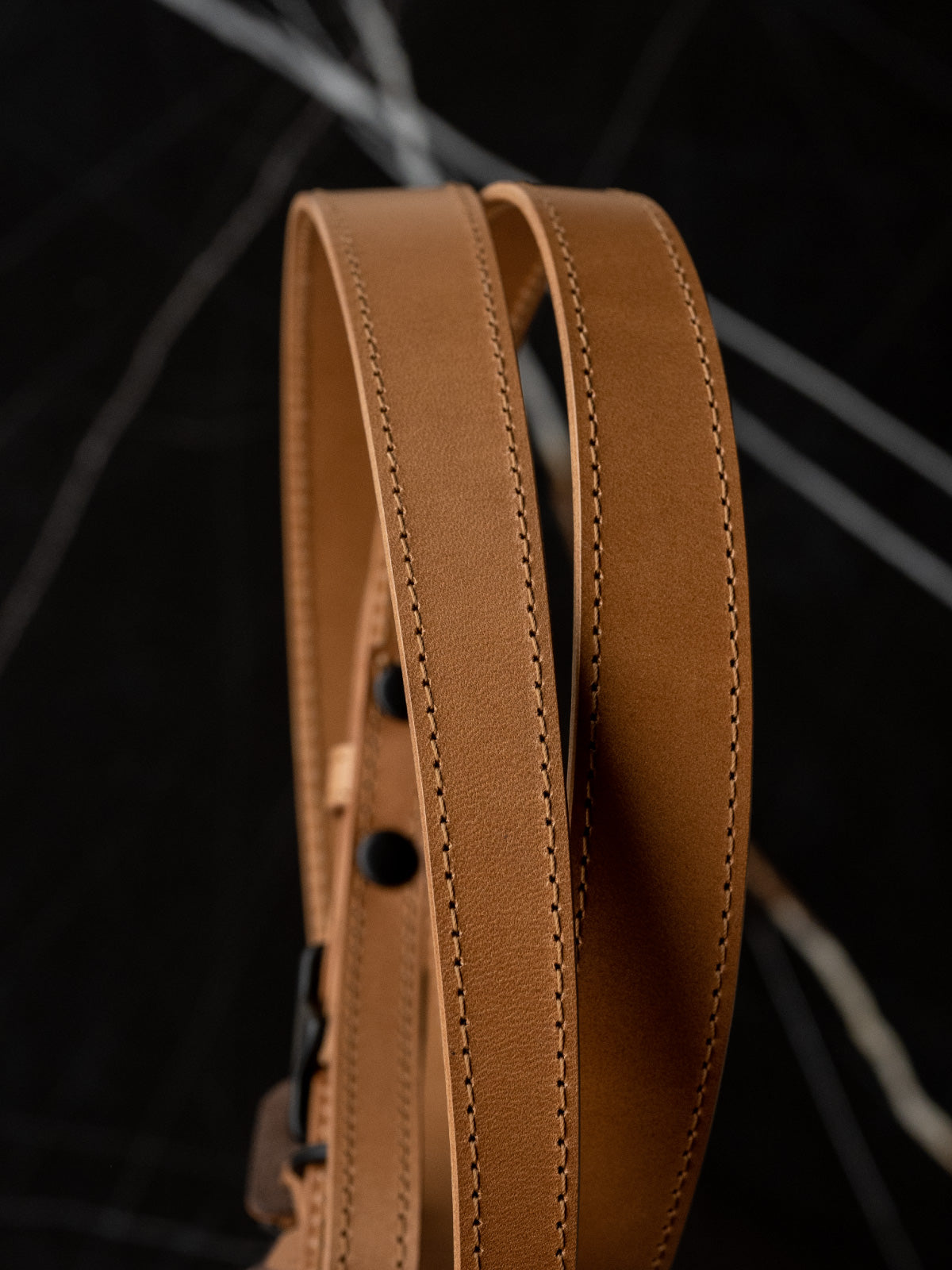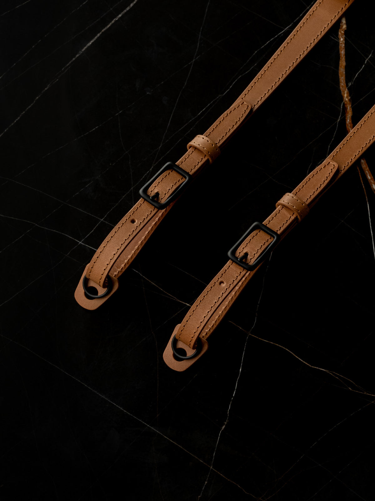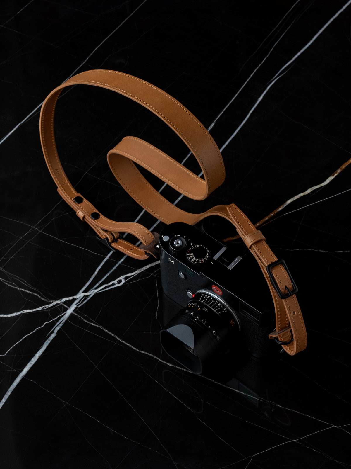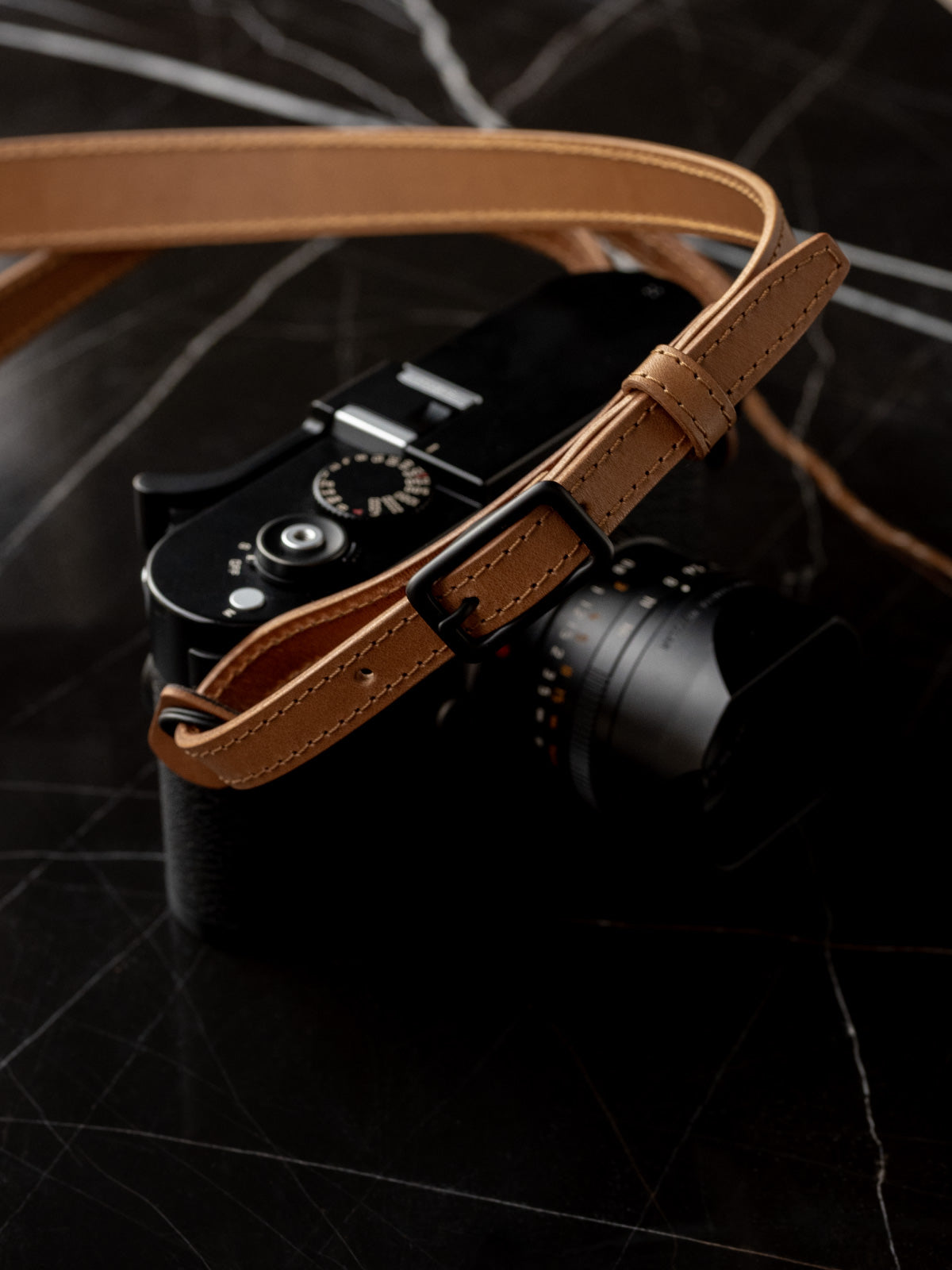 All of the hardware—including the center bar buckles, double-capped rivets, and split rings—are plated in a highly durable matte black PVD coating, adding to the stealth nature of mirrorless cameras.