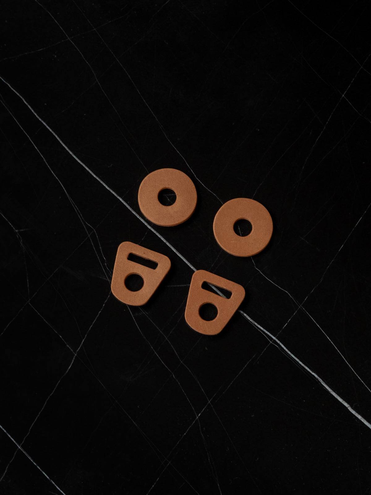 Two options for leather tabs lined with suede fit over the round lug mounts and protect the camera from the pair of 304 stainless steel split rings.