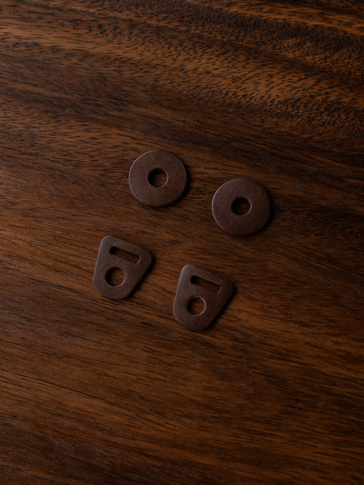 Two options for leather tabs lined with suede fit over the round lug mounts and protect the camera from the pair of 304 stainless steel split rings.